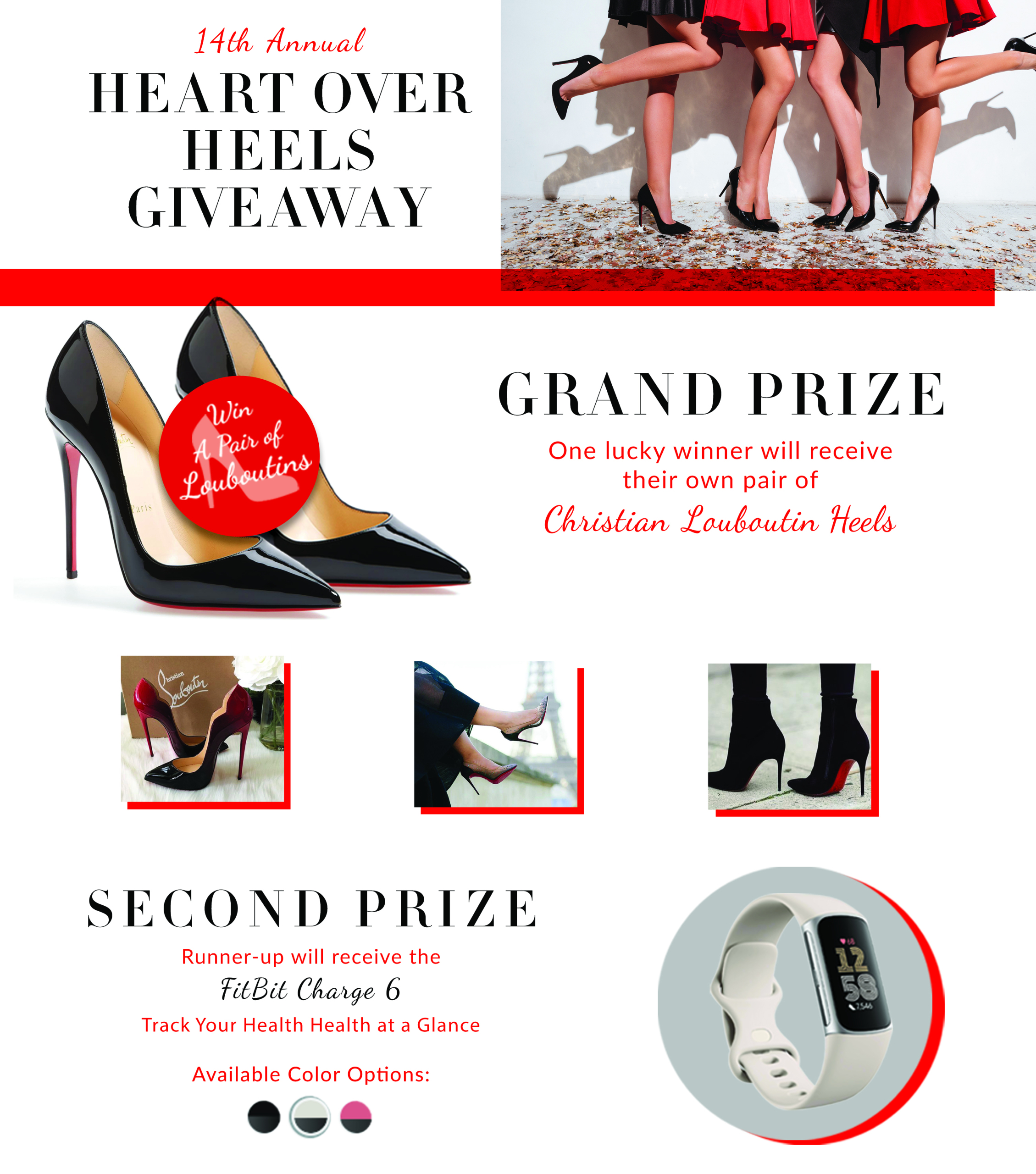 Celebrate Heart Health Month & help Spa Week Media donate to the American Heart Association by entering the Heart Over Heels Giveaway! Enter for your chance to be one of two lucky winners! The grand prize is a pair of Christian Louboutin shoes, and the second prize is a Fitbit Charge 6!