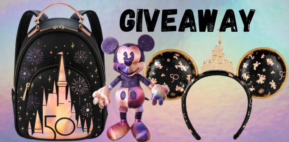 Prize: 1 Walt Disney World 50th Anniversary Loungefly Mini Backpack, 1 Ear Headband, and 1 Mickey Mouse “Grand Finale” Plush.
