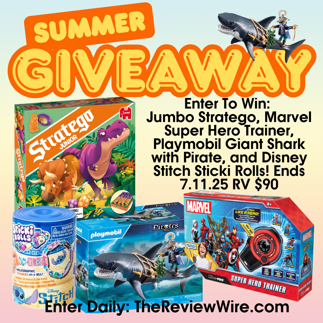 Enter for a chance to win four games that include Jumbo Stratego, Marvel Super Hero Trainer, Playmobil Giant Shark with Pirate, and Disney Stitch Sticki Rolls (RV $90)! PLUS, four runners-up will have the chance to win a Playmobil Giant Shark with Pirate (RV $35).