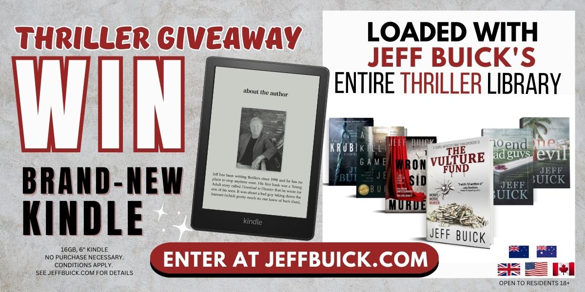The winner gets a brand–new Kindle eReader loaded with thriller author Jeff Buick’s entire library – this includes the ITW award-winning A Killing Game and the rest of the Curtis Westcott crime series collection including his latest release The Vulture Fund (also nominated for an ITW award).