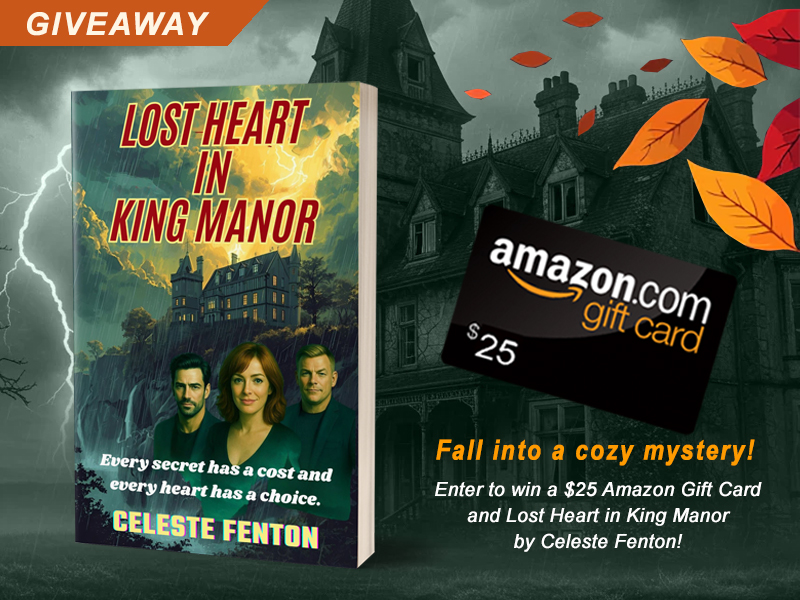 Enter for a chance to win a copy of the cozy mystery Lost Heart in King Manor by Celeste Fenton and a $25 Amazon Gift Card.